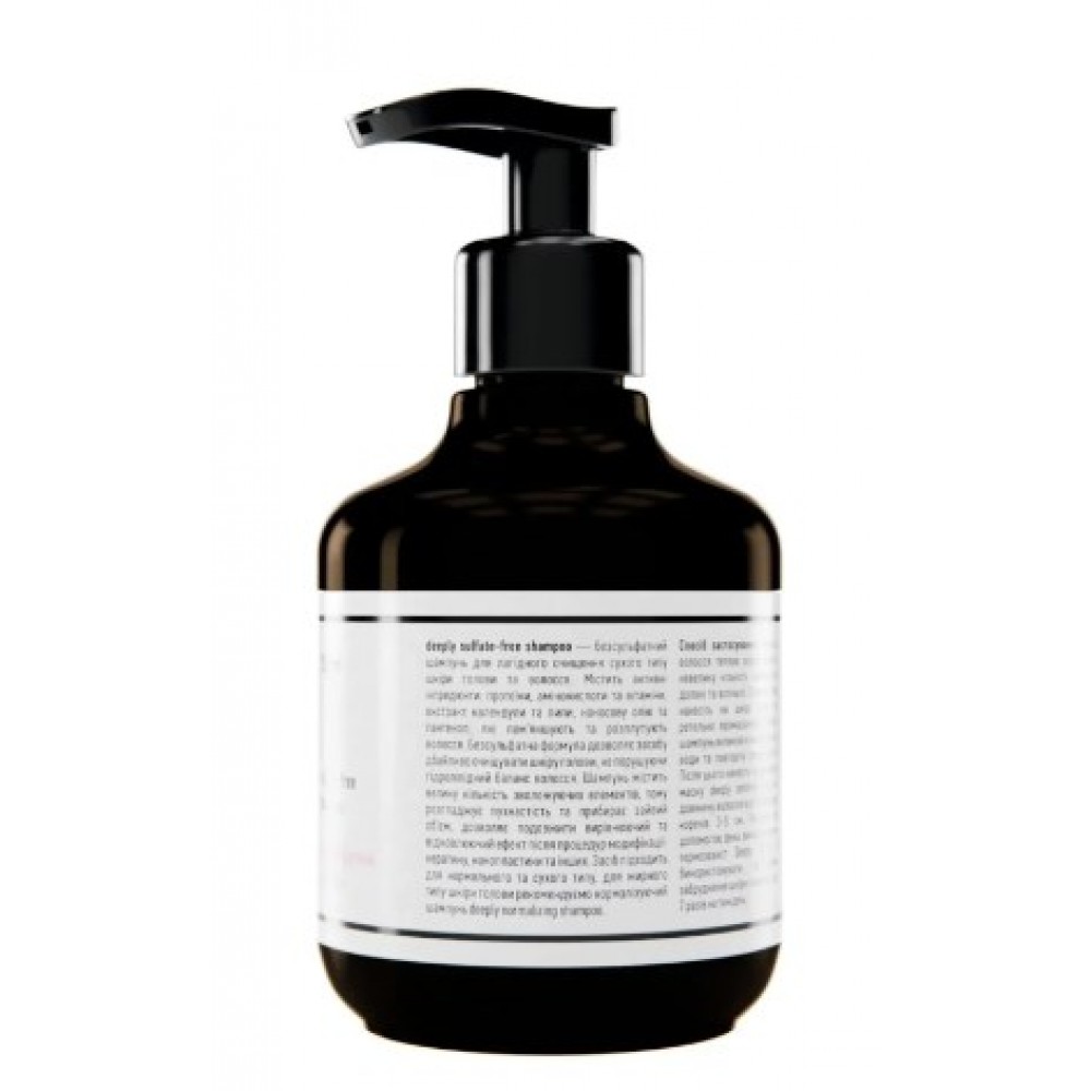 Безсульфатний шампунь deeply sulfate-free shampoo — шампунь для лагідного очищення сухого типу шкіри голови та волосся. Містить активні інгредієнти: протеїни, амінокислоти та вітаміни, екстракт календули та липи, кокосову олію та пантенол, які пом’якшують та розплутують волосся. Працюючи делікатно, цей шампунь проти сухості дбайливо очищує шкіру голови, не порушуючи гідроліпідний баланс. Засіб містить велику кількість зволожуючих агентів, тому ефективно розгладжує пухнастість та прибирає зайвий об’єм. Доречно купити шампунь для сухого волосся, також можна використовувати як ніжний догляд, щоб подовжити вирівнюючий та відновлюючий ефект після процедур модифікації: кератину, нанопластики та інших. А щоб шкіра голови залишалась здоровою та чистою, долучаємо освіжаючий пілінг для шкіри голови deeply refreshing scalp peeling.