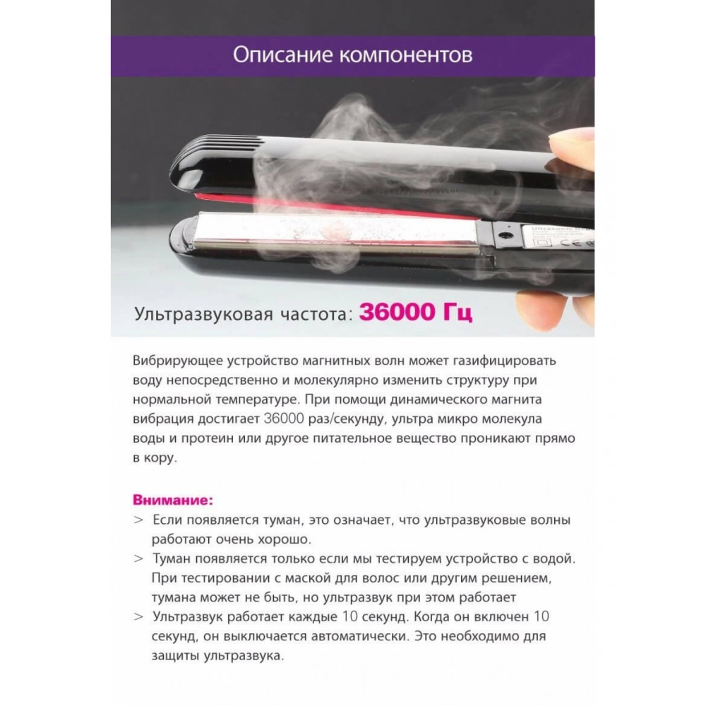 Інфрачервона ультразвукова праска для відновлення та лікування волосся Інфрачервона ультразвукова праска призначена для безпечної реконструкції сухих пошкоджених локонів шляхом перетворення на пар компонентів із лікувальних засобів та складів для відновлення. Девайс складається з двох пластин – з ультразвуковим та інфрачервоним впливом. Ультразвук подрібнює поживні речовини, завдяки чому вони швидше проникають у структуру локонів. Інфрачервоне випромінювання – відкриває/закриває лусочки кутикули, завдяки чому живильні компоненти зберігаються всередині волосся. Особливості інфрачервоного ультразвукового прасування: відновлює структуру локонів на клітинному рівні; забезпечує блиск та шовковистість; усуває проблему кінчиків, що січуться; закріплює колір та реконструює структуру фарбованого волосся; дозволяє уникнути теплової дії на волосся; оснащений поворотним на 360 градусів шнуром; має 7 режимів.