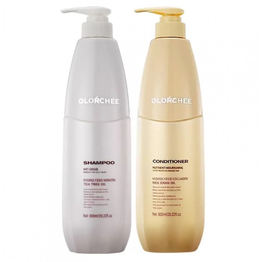 Шампунь Olorchee Anti Grease Shampoo с маслом чайного дерева и гидролизованным кератином глубоко очищает, уменьшает жирность и освежает кожу головы, а кондиционер Olorchee Nutrient Nourishing Conditioner восстанавливает поврежденные участки волос, делает полотно более гладким и эластичным.