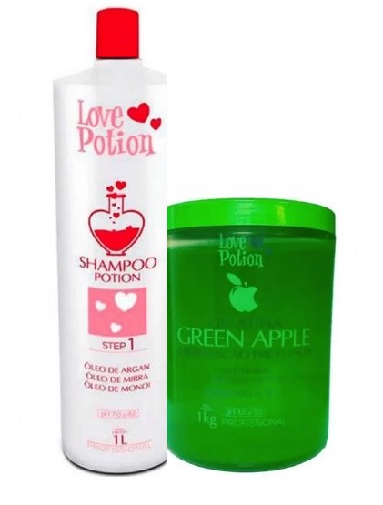 Love Potion Gelatina Green Apple (Бразилія) - "яблучний" варіант всіма улюбленого колагенового засобу. Створено для реконструкції тонких, слабких, тьмяних, ламких, зневоднених і пошкодженого волосся будь-якого типу.